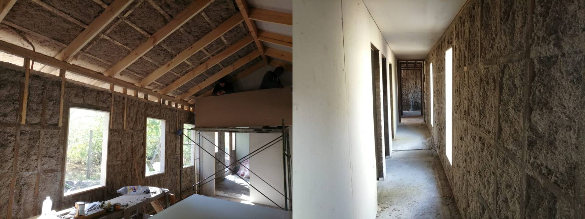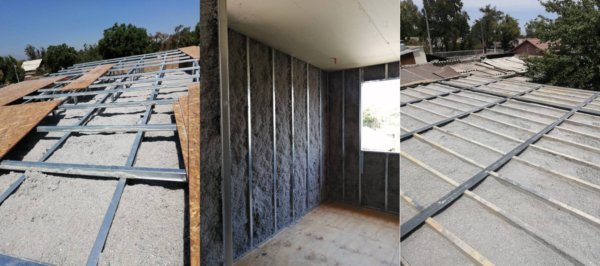 Imágenes instalación aislación celulosa inyectada (insuflada), a presión dentro de la cavidad de cielos y tabiques; al insuflar celulosa siempre debe ser realizado a cavidad completa del elemento a aislar.